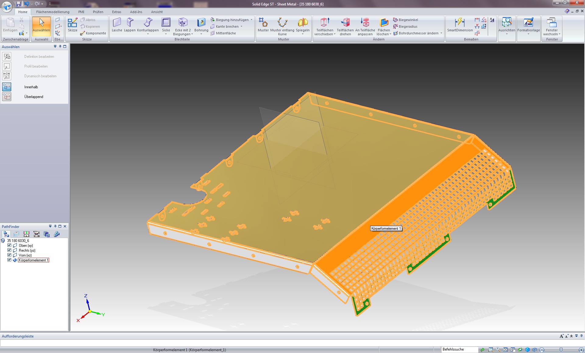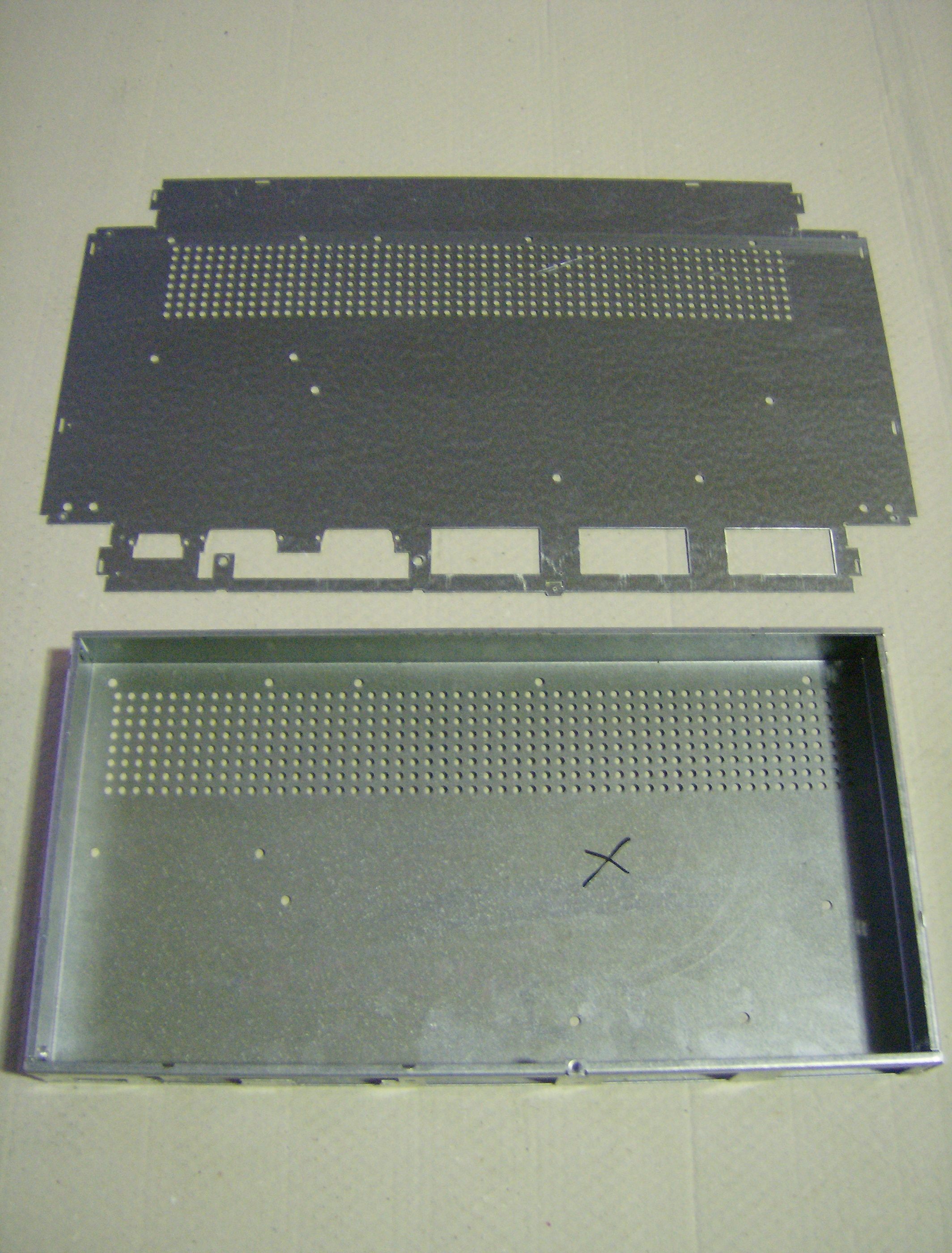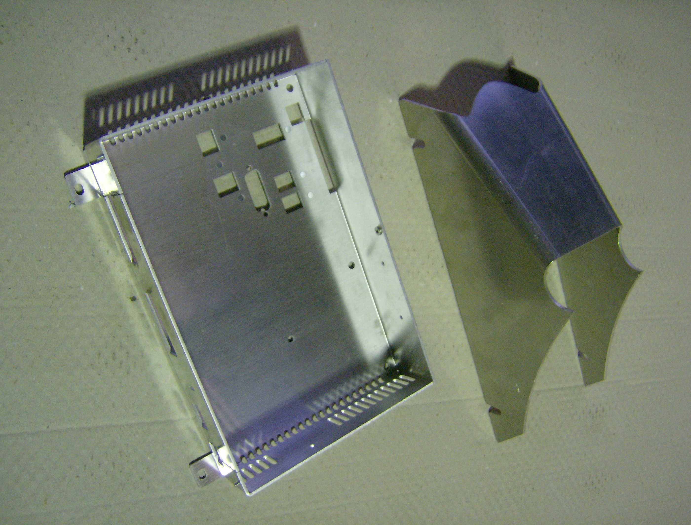 Blechteile in Kombifertigung: Stanzen - Nibbeln - Lasern in einer Aufspannung auch mit Umformungen im Blechteil. z B. Ansenkungen, Brücken, Näpfe, Gewinde